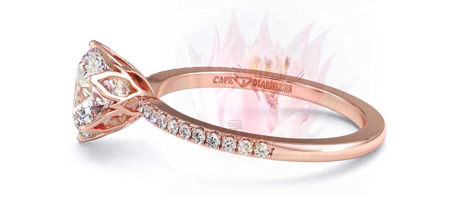 Start with a Fynbos rose gold setting then choose a natural diamond Custom build your Blushing Bride, Pincushion, or Disa engagement ring in Cape Town, South Africa.