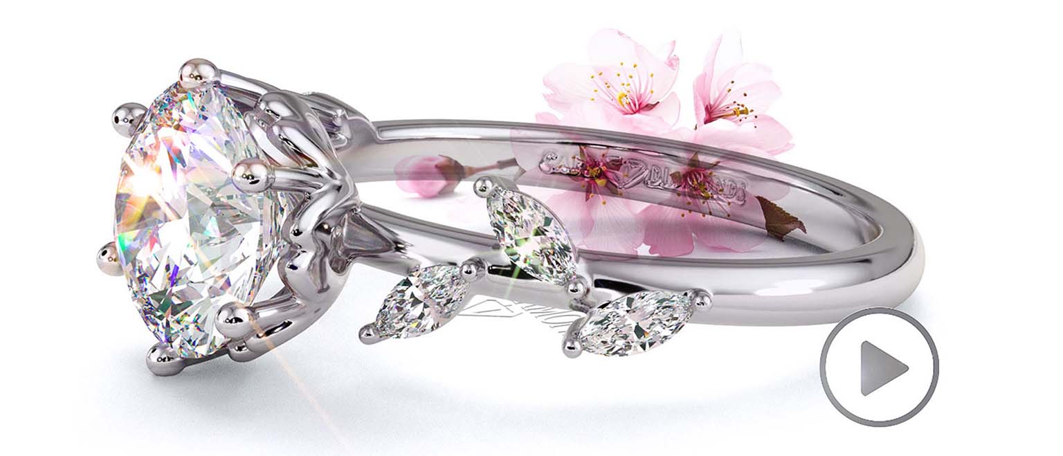 Let your love bloom with our Cherry Blossom engagement ring. This floral beauty is crafted in Platinum and decorated with sparkling marquise cut diamonds that builds up to the delicate setting that resembles the petals of the cherry blossom flower. T