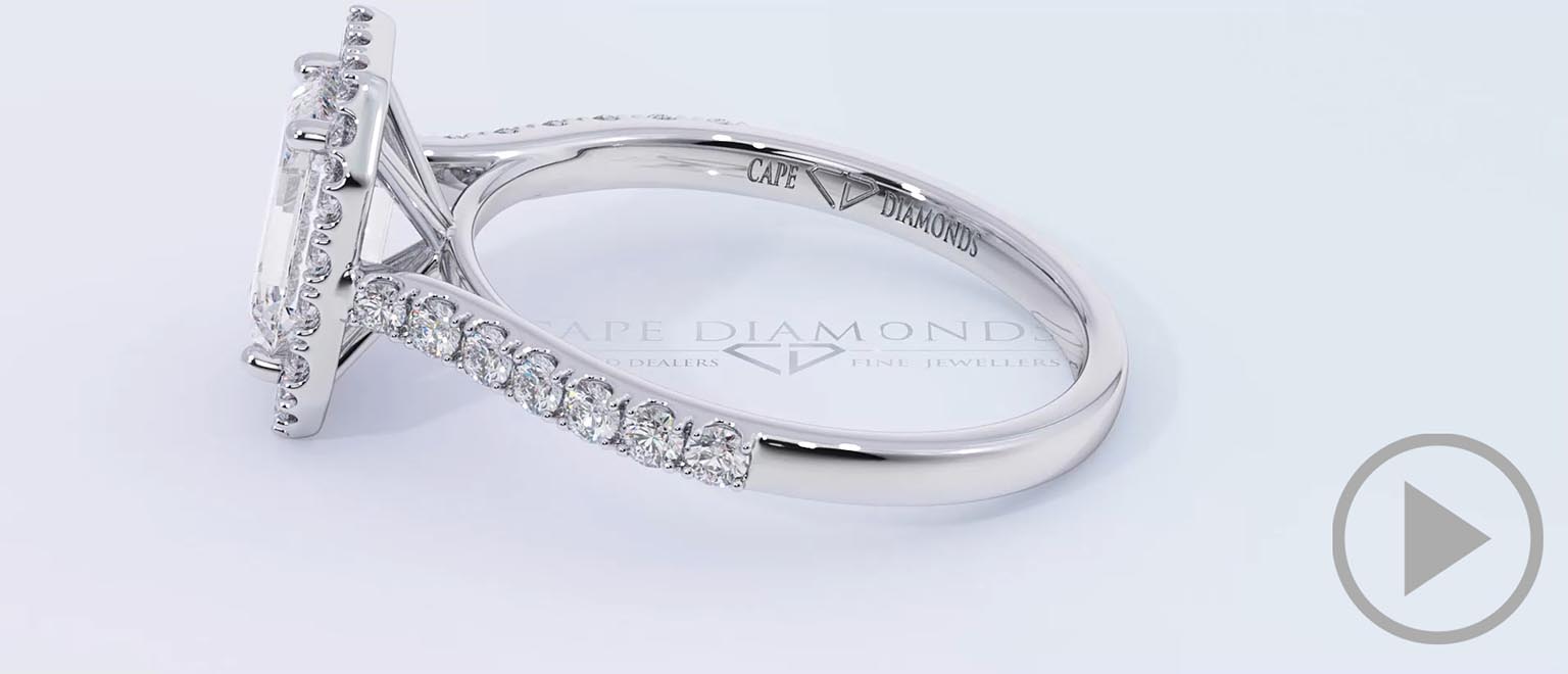 This flawless emerald cut halo ring will dazzle anyone with its gorgeous 4-claw setting and halo of pavé diamonds. The white gold band shimmers with tiny diamonds cascading and framing the opulent centre stone. This authentic diamond ring is availab