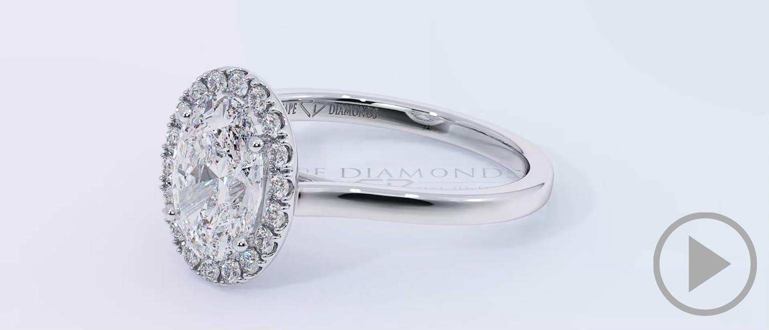 The most highly-regarded Cape town engagement ring producer brings you this outstanding design that consists of a plain square-edged platinum band reaching toward a halo of pave diamonds. Pavé diamonds move gracefully around a luminous oval diamond