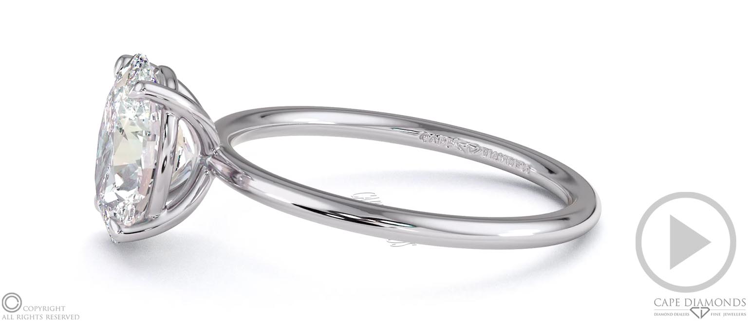 Sleek and refined, this platinum or white gold oval solitaire diamond ring is designed for those who appreciate minimalist elegance. The oval diamond is held by four cat claw prongs that emphasize its shape and enhance its brilliance, while the thin