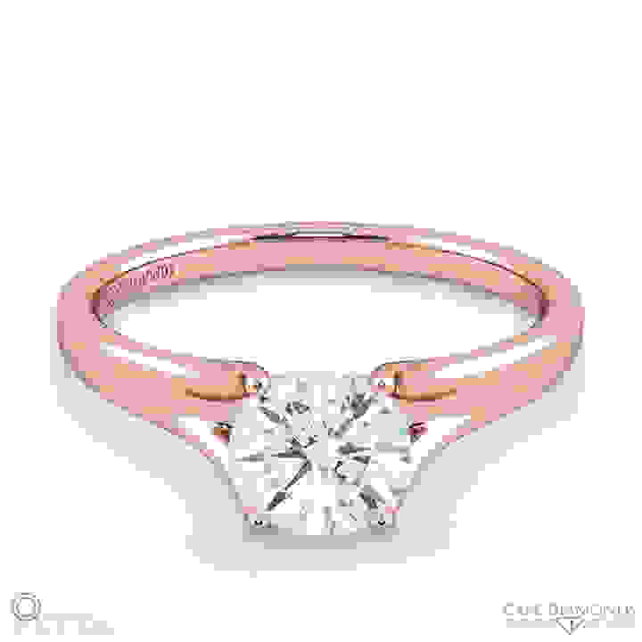 A masterfully crafted designer rose gold and diamond engagement ring with a modern twist. This diamond ring design shows a stunningly unique 4-claw setting holding a perfect solitaire round-cut diamond on a rounded rose gold band – A gorgeous diamo