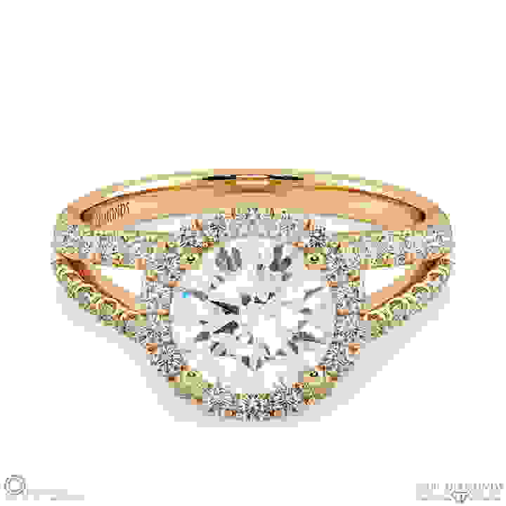 Elegance personified. This gorgeous classic design showcases a captivating round cut stone with a pavé halo and matching pavé South Africa diamonds that sparkle down the split gold band. Diamonds and gold are wrapped into a perfect piece of jewelle