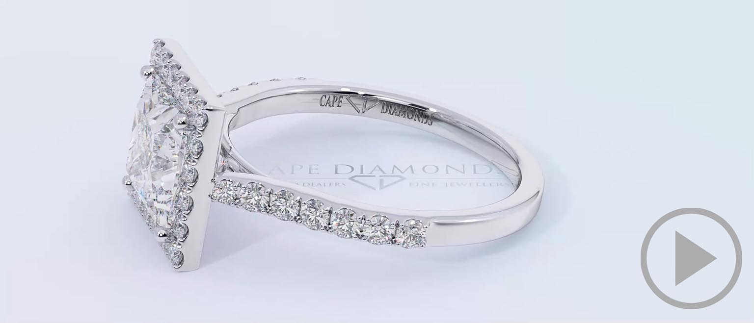 A unique diamond engagement ring – this elegant princess-cut diamond is encompassed in a halo of pavé diamonds and gripped by a 4-prong setting. The immaculate white band sparkles with exquisite pavé diamonds accentuating the authentic design. Ex