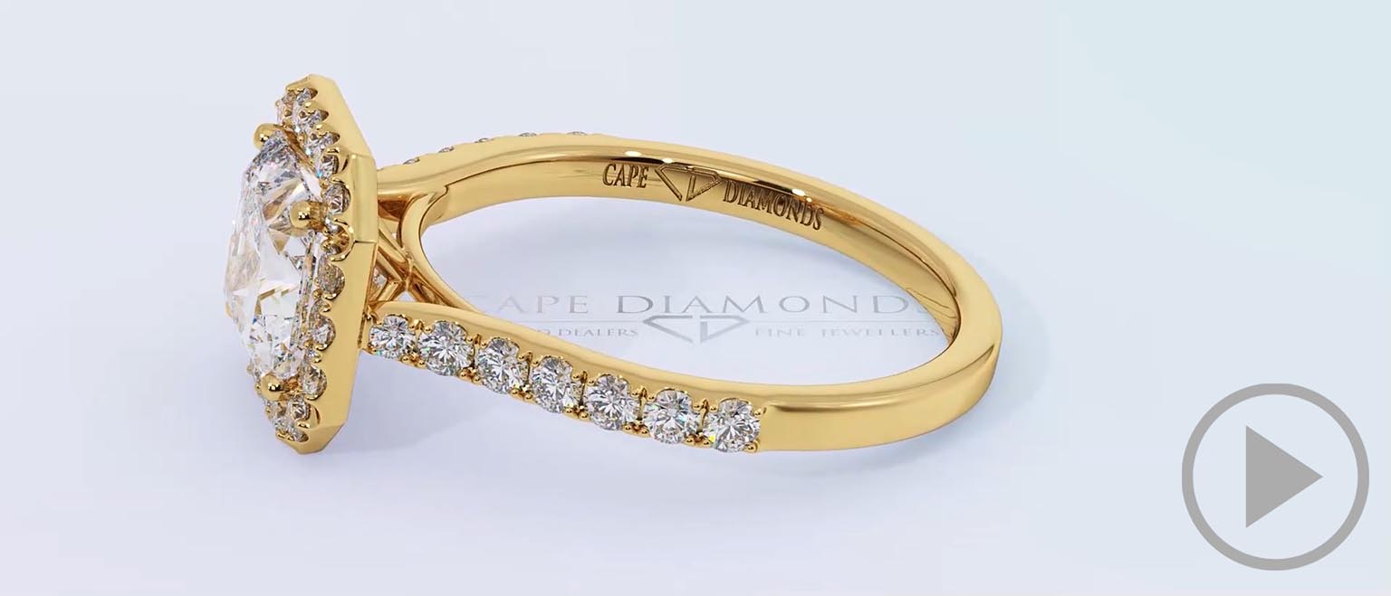 A wholesale designer diamond ring for women brought to you by Cape Diamonds. Mastercrafted to perfection, this radiant cut stone shines impeccably with a gorgeous halo of pavé diamonds. The yellow gold shank glitters with tiny gems that cascade half